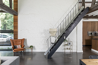 Druhý zákazník: Točité schodiště přes dvě patra, nestandardní šířka, ostrá zatáčka, venkovní provedení, vlastní barevné čalounění.