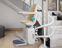 Schodišťová sedačka určená pro točitá a lomená schodiště, s jednotrubkovou dráhou a bezkonkurenční prostorovou náročností.